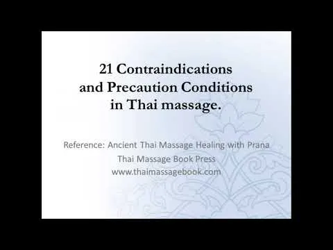 نظرة عامة على 21 موانع وحالات تتطلب الحيطة في ممارسة التدليك التايلاندي. يوضح الفيديو متى يجب تجنب العلاج ومتى يجب المتابعة بحذر ويقدم قائمة تحقق موجزة لمساعدة الممارسين والعملاء على تحديد الحالات التي تتطلب تعديل او تأجيل او موافقة طبية لضمان السلامة خلال العلاج اليدوي.