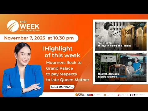 This Week with Thai PBS World 7 novembre 2025 passe en revue des enjeux nationaux et regionaux, y compris le deuil national au Grand Palace, la soie thaie et la reine mere, des comparaisons de tarifs BTS dans l ASEAN, les liens commerciaux et de defense Canada Thailande, et une visite culturelle du quartier Talat Phlu a Bangkok.