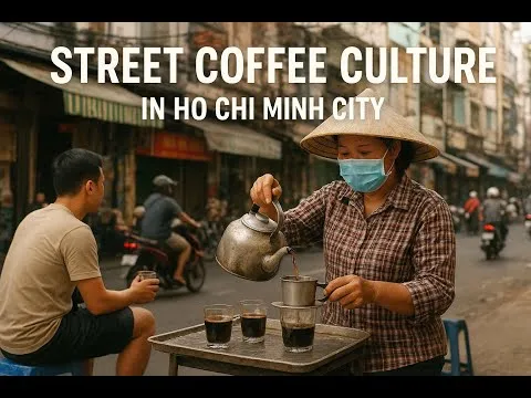 Ce court metrage documente la culture du cafe de rue a Ho Chi Minh, montrant des installations au bord du trottoir avec de petits tabourets en plastique et des cafes locaux forts ou se rassemblent des personnes diverses.