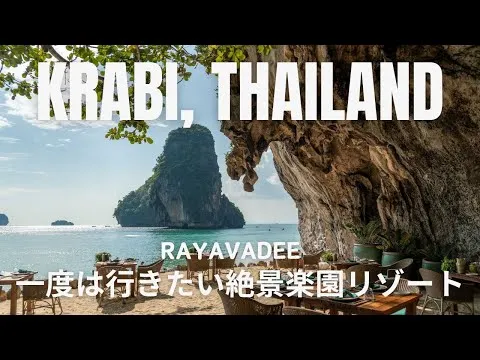 סיור במתחם Rayavadee בחצי האי Phranang בקראבי המציג ארוחת בוקר, שטחי הריזורט, גישה לחוף, סיור בחדר ואכילה ב The Grotto. הסרטון מדגיש את המיקום בין צוקי הסלע הגיריים, החופים והגנים הטרופיים ומציב את הנכס כבעל עיצוב מוקפד ועשיר בטבע, תוך ציון התייחסויות למחירים