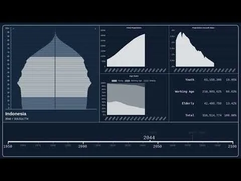 Tömör animáció Indonézia népességpiramisáról 1950–2100 közötti időszakra, frissítve a World Population Prospects 2024 adataival.
