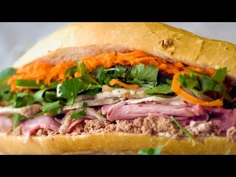 This explanatory video defines what banh mi is and explains how it differs from other sandwiches. The host lists essential parts: the Vietnamese baguette, common fillings such as pate and seasoned meats, pickled vegetables, herbs and sauces, and typical ways it is served in Vietnam.