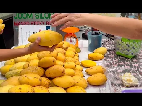 Sokak gorunumu ile otantik mango sticky rice gosteren video satıcıların tatlı hindistan cevizli yapışkan pirinci taze mango ve kremalı sos ile nasıl tabakladığını gosterir. Video mevsimsel dikkate alinacak noktaları, doku kontrastlarını ve müşterilerin pazarlarda ve tatlı arabalarında siparis ederken neler bekleyebileceğini aciklar.