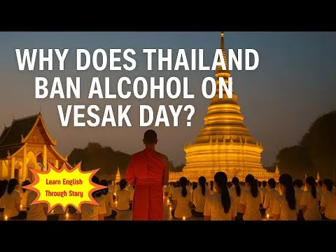 Епізод подкасту з вивчення англійської для середнього рівня, який досліджує, чому Таїланд вводить загальнонаціональну заборону на алкоголь у День Весак, поєднуючи навчання через історії з культурними та правовими поясненнями.
