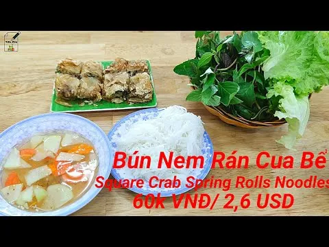 Відео в стилі вуличної їжі що фіксує bun nem ran крабові спрінг ролли в крамниці у Вєтнамі, з акцентом на північний стиль смажених рулетів з крабом, їх текстуру та як їх подають з локшиною та зеленню. Кліп показує їжу на місці та сервірування для глядачів зацікавлених у регіональних варіантах смажених рулетів.