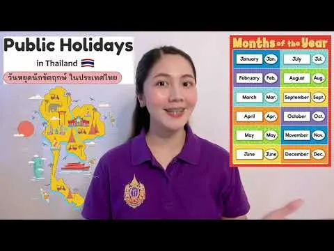 Mot bai hoc ESL gioi thieu cac ngay le cong chinh o Thai Lan va cac thang trong nam bang tieng Anh. Nguoi thuyet trinh bao gom ten cac ngay le va tu vung cac thang de giup nguoi hoc nhan biet ngay thang va cac thuoc tinh mua va xay dung ngon ngu co ban lien quan den lich.